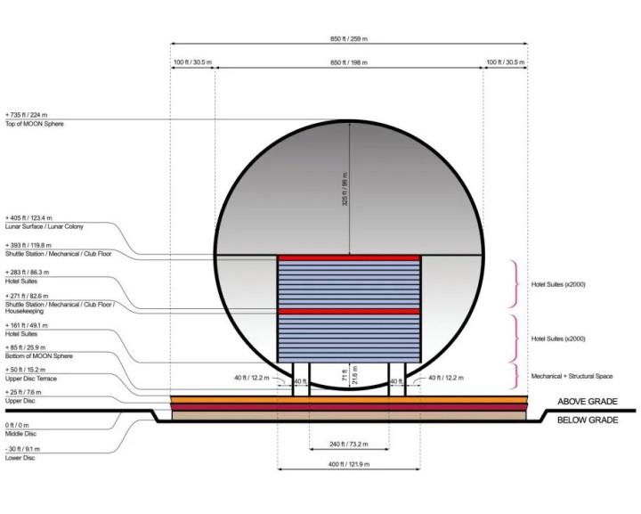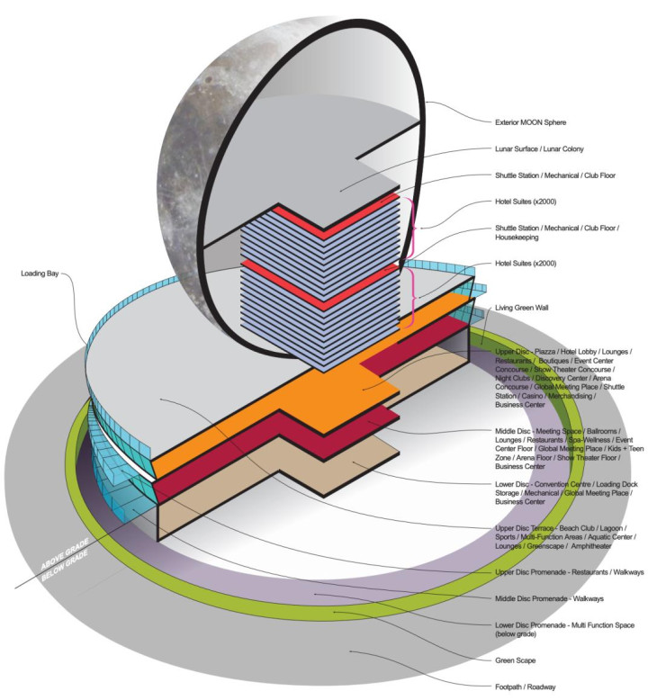 这一大胆构想由Sandra G. Matthews和Michael R. Henderson共同提出,概念来自月亮世界度假村公司。按照方案规划,工程一旦实施,即可在4年内建成。