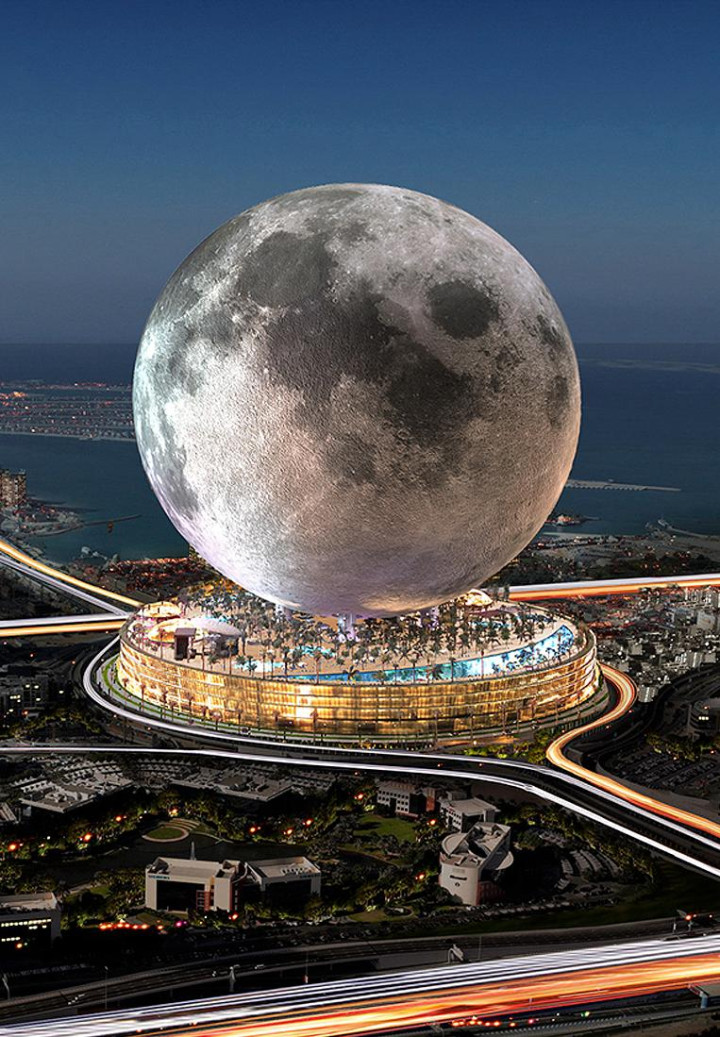整座度假村的外观被设计成月球的样子,虽然尺寸仅为实际月球的1/75,000,但远望去,就像一轮圆月静静悬浮于沙漠之上。其球体建筑高达224米,直径达198米,外表覆盖着模拟月表的地形层,生动还原了月球独有的荒凉与神秘。